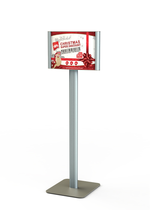 The TS Poster Display Stands uses a center pole structure, made of the Leader Urban aluminum profile bolted to a powder coated steel base plate . The curved faced poster frame uses our curved faced snap frames Radius Snap Slim , double sided as default . frame sizes are fitted to DIN paper size inserts ranges A4 to A2mm 500mm max. wide. Wheels for easy moving is an option as well as special floor mounted base. This practical use display stand is commonly used in hotels, hospital venues halls etc’, for directional and various uses. Stand height are usually 120-140cm high , however higher units up to 170cm can be ordered with a larger base plate . changing the printed inserts is simple using the side snap profiles .